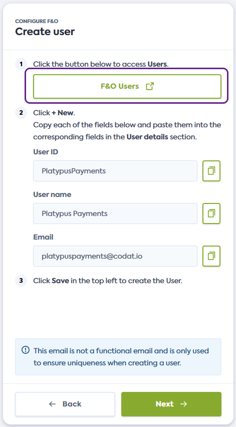 1. On the Create user screen of the connection flow, click the link provided. It will open the Users page of Dynamics F&O in a new window.