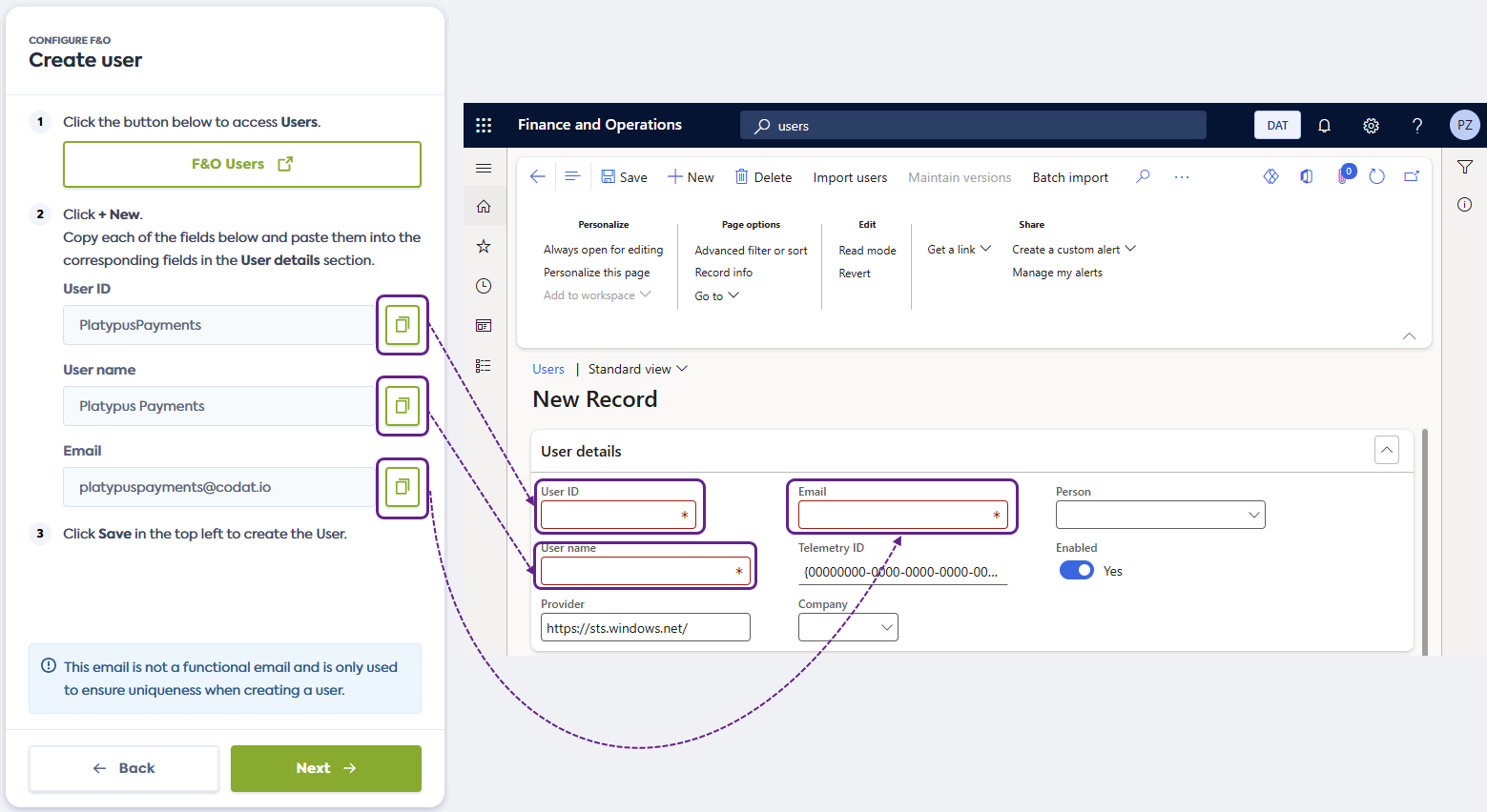 3. Copy the proposed User ID, User name, and Email from the connection flow and paste them into the corresponding fields in Dynamics 365 F&O.